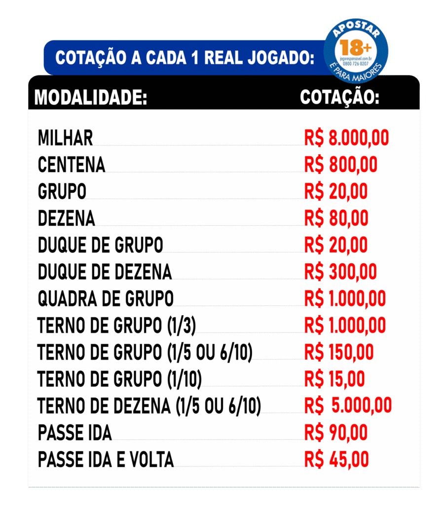 Quadra/Grupo 1ºao5º – A modalidade é feita com 4 grupos escolhidos de 01 a 25, podendo ser repetidos ou não, são válidos os grupos do resultado do 1º ao 5 º prêmio do resultado, podendo a aposta ser feita com 4 a 10 grupos.
